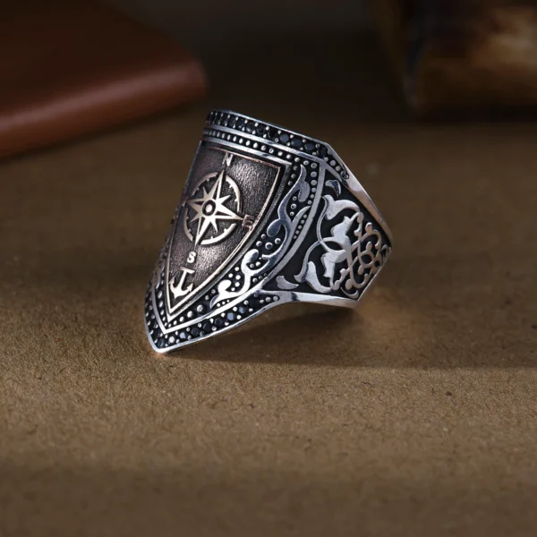 Pusula Modeli 925 Ayar Kalkan Zihgir Gümüş Erkek Yüzük