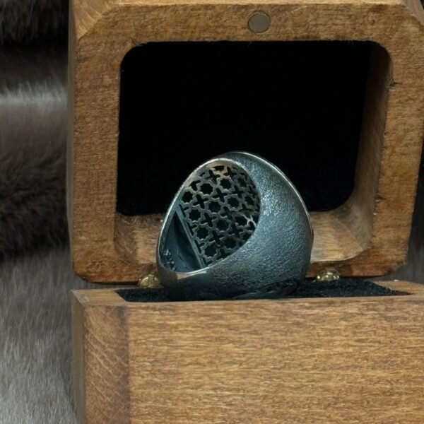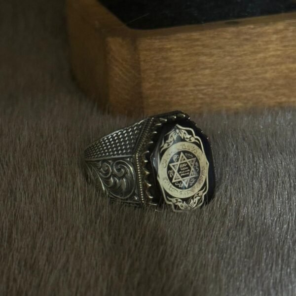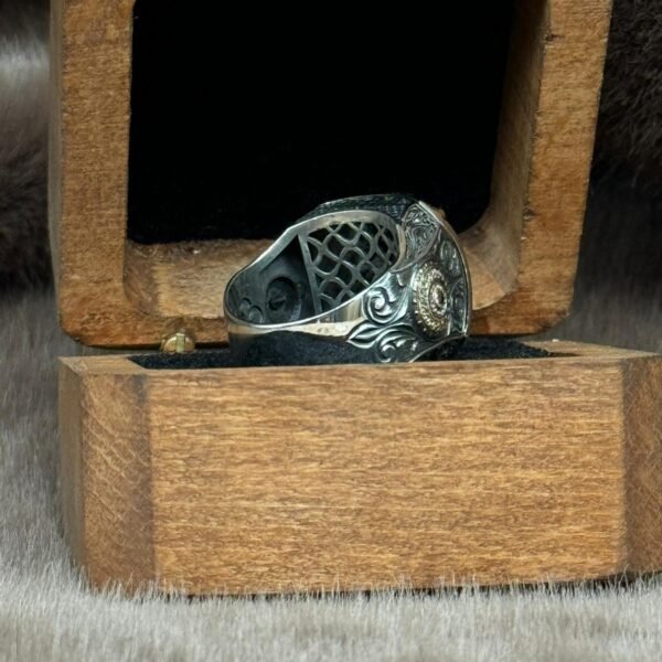 Yanları Gravür Desenli Olup Üzeri Kehribar İçine Hz Süleymanın Mührü İşlenmiş 925 Ayar Gümüş Erkek Yüzüğü